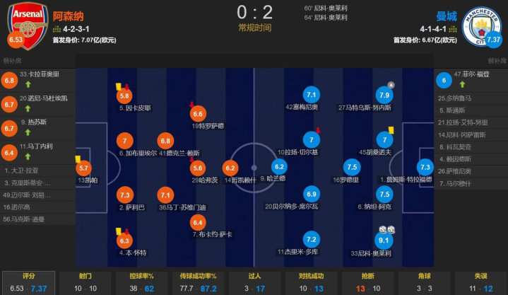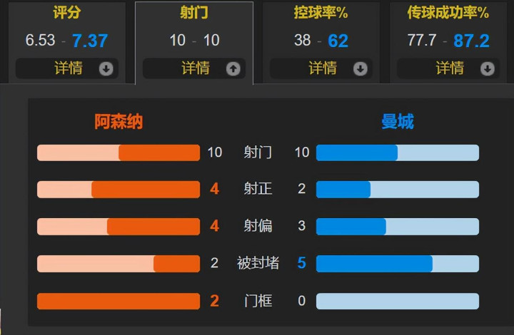 数据反差拉满:极致后果制胜,曼城射正即进球,枪手空有攻势
