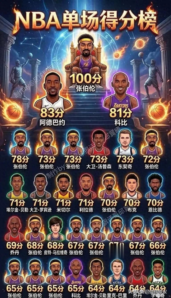 NBA历史单场得分榜,那是篮球宇宙里最血腥的夷戮名单。能上榜的,要么是上古神兽,要么是得分机器,要么——是那天晚上手感烫得能把篮筐溶化的东说念主。