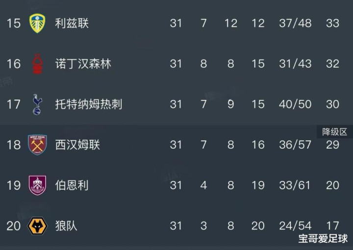 终末再来望望保级区,目下狼队积17分链接垫底,伯恩利积20分名次倒数第二,基本仍是锁定了两个左迁限额,终末1个左迁限额将会在33分的利兹联、32分的诺丁汉丛林、30分的热刺和29分的西汉姆联之间产生。利兹联最近5轮英超3平2负,终末7个英超敌手顺次是曼联、狼队、伯恩茅斯、伯恩利、热刺、布莱顿和西汉姆联,其中有4个敌手齐是处于左迁区的。诺丁汉丛林最近5轮英超1胜2平2负,终末7个敌手顺次是阿斯顿维拉、伯恩利、桑德兰、切尔西、纽卡斯尔、曼联和伯恩茅斯,除了伯恩利之外,敌手大量实力较强,除此之外诺丁汉丛林还有欧联杯比赛任务。