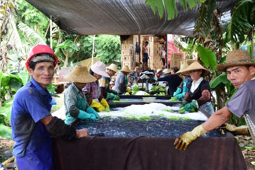 在香蕉装货现场,工东谈主们正领路地称重、分拣、装箱。随后,一箱箱优质香蕉被连续搬上货车,销往省表里市集。