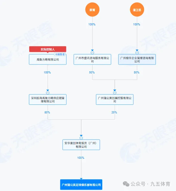 九、广州蒲公英足球俱乐部该俱乐部确立于2020年6月30日,注册成本为300万元,法定代表东谈主是李斌。股权结构是安华富创体育投资(广州)有限公司握股100%,最终本体截止东谈主是注册在香港的一家企业——禹衡方略有限公司。