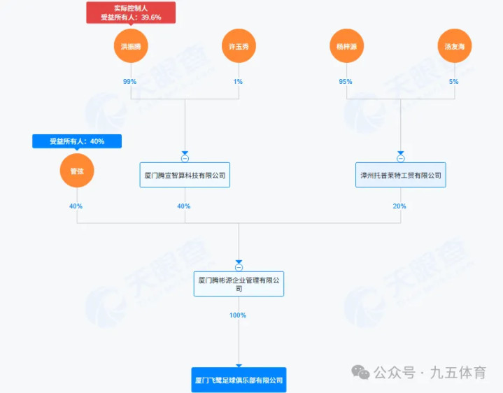 三、厦门飞鹭足球俱乐部该俱乐部确立于2019年3月26日,注册成本为100万元,法定代表东谈主是连晋俊。股权结构是厦门腾彬源企业处治有限公司握股100%,最终受益总计东谈主是管弦、洪振腾。