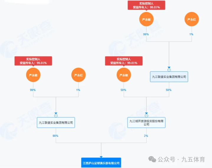 六、江西庐山足球俱乐部该俱乐部确立于2012年2月23日,注册成本为1500万元,法定代表东谈主是芦宁江。股权结构是九江联盛实业集团有限公司握股98%、九江城开旅游投资股份有限公司握股2%,最终本体截止东谈主是严永敏。